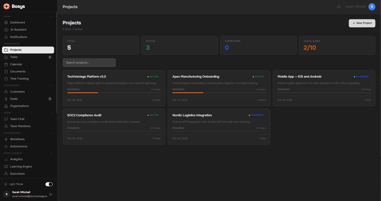 The moment Bosys builds your OS, your dashboard is live. Revenue, pipeline, customers, tasks, goals — all connected and updated in real time.